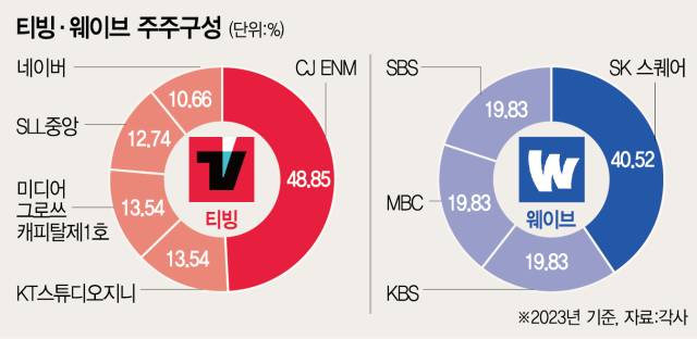 현재 티빙의 최대주주는 CJ ENM(035760)(48.85%), 웨이브의 최대주주는 SK스퀘어(40.52%)다. 나머지 지분은 티빙 측 ▲KT스튜디오지니(13.54%) ▲미디어그로쓰캐피탈제1호(13.54%) ▲SLL중앙(12.74%) ▲네이버(10.66%) 웨이브 측 ▲KBS(19.83%) ▲MBC(19.83%) ▲SBS(19.83%)으로 구성돼 있다.