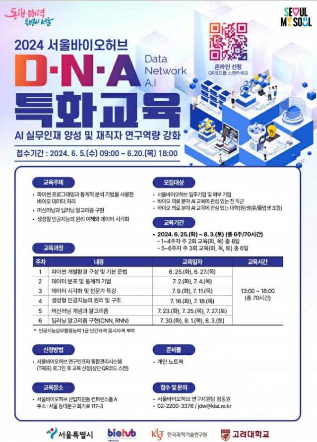 교육 대상은 △서울바이오허브 입주기업 및 외부기업 △바이오의료분야 AI교육에 관심있는 전 직군 △바이오의료분야 AI교육에 관심있는 대학생 및 대학원생(휴학생과 졸업생 포함) 등이다. 교육은 6월 25일부터 8월 3일까지 6주간(총 14회차, 70시간) 오프라인으로 진행한다.