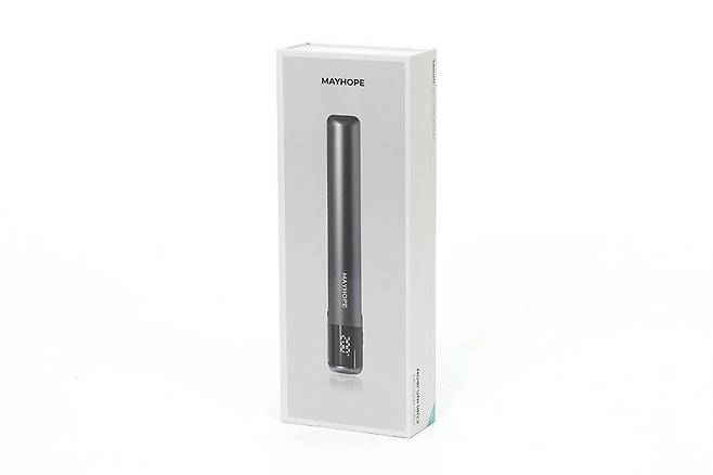 메이홉 그래핀 프로 고데기 MA-0300은 길쭉한 박스에 담겨 있다. 박스 앞면에는 제품의 이미지가 인쇄되어 있어서 개봉 전에도 디자인을 가늠할 수 있다.