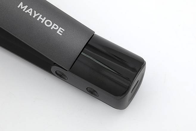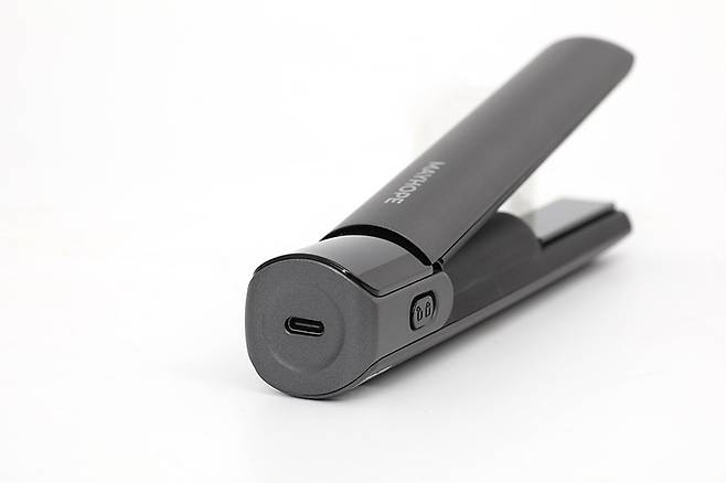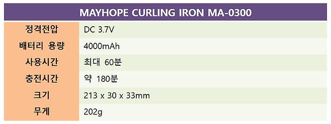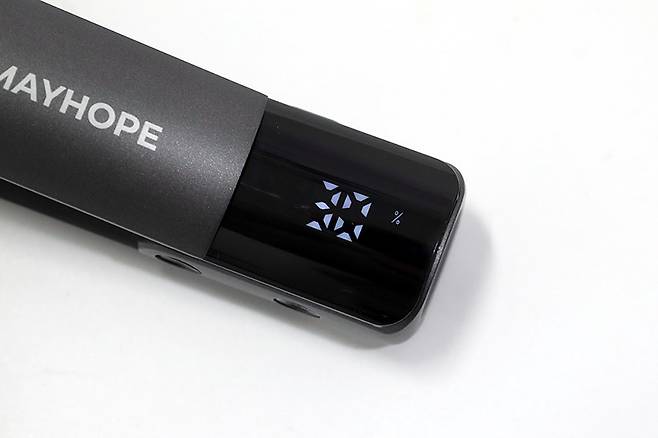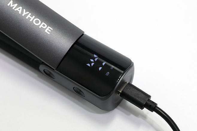 메이홉 그래핀 프로 고데기 MA-0300을 사용하려면 우선 충전이 필요하다. 충전 케이블을 연결하면 배터리 충전 상태가 퍼센트로 표시되고, 충전 중임을 알리는 배터리 로고도 나타난다. 배터리는 4000mAh의 대용량을 탑재해 한 번 충전으로 최대 1시간가량 사용할 수 있다.