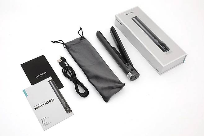 구성품으로는 메이홉 그래핀 프로 고데기 MA-0300 본체와 소프트 파우치, 충전용 USB 케이블, 그리고 사용 설명서와 보증서가 제공된다.