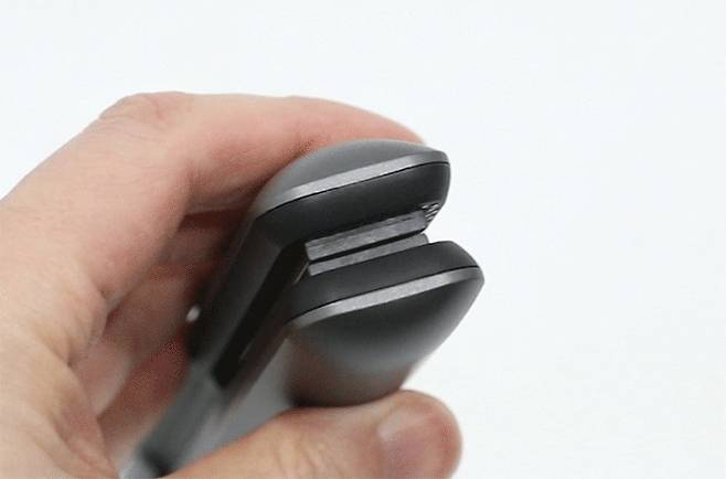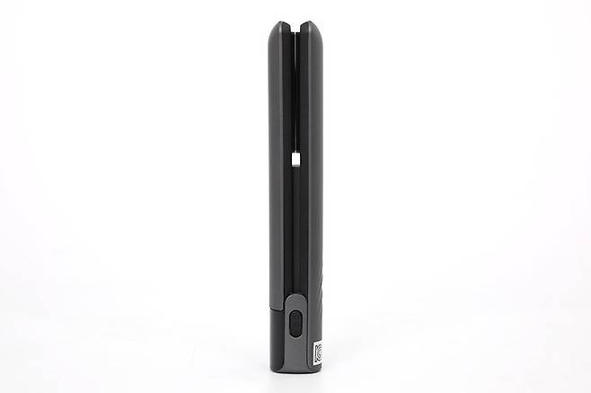 옆에서 바라본 본체의 모습은 일직선으로 된 부분과 한쪽으로 벌어진 부분으로 이루어져 있는 판 고데기의 전형적인 형태임을 알 수 있다.
