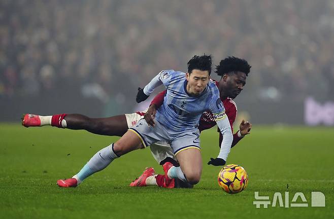 [노팅엄=AP/뉴시스] 토트넘 홋스퍼의 손흥민이 26일(현지시각) 영국 노팅엄의 더 시티 그라운드에서 열린 2024-25 프리미어리그 18라운드 노팅엄 포레스트와 경기 중 공을 다투고 있다. 손흥민은 81분을 소화하면서 공격 포인트를 올리지 못했고 팀은 0-1로 패했다. 2024.12.27.