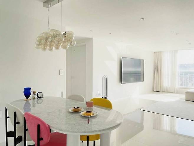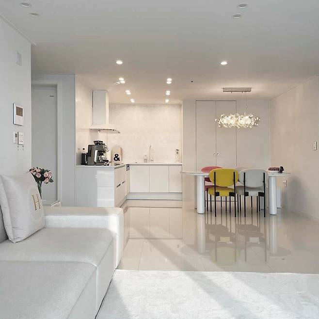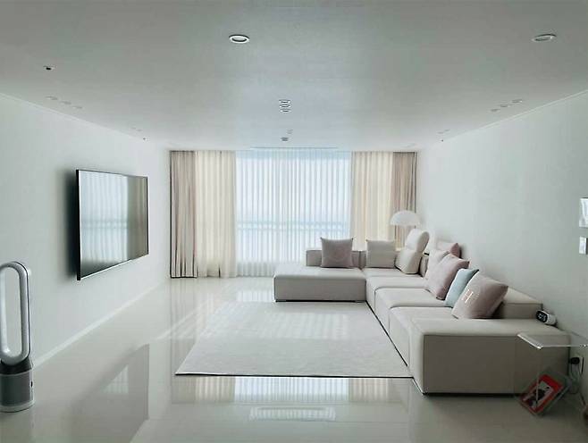 현관을 지나면 마주하게 되는 거실은 화이트 대리석 바닥과 벽걸이 TV로 미니멀한 분위기를 연출했습니다.