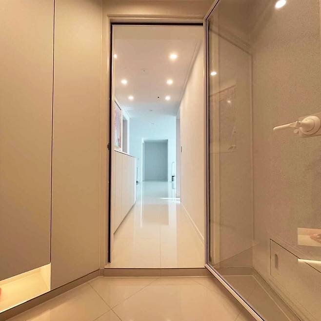 집 전체에 동일한 타일을 연결해 바닥을 깔아 공간감이 확장된 것처럼 느껴지게 했고, 매립 등을 활용한 자연스러운 조명으로 별다른 장식 없이도 안정감을 줍니다. 특히 현관에는 투명한 중문을 설치해 시각적 개방감을 살리면서도 공간의 구분을 명확히 했습니다.