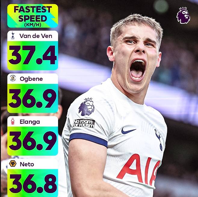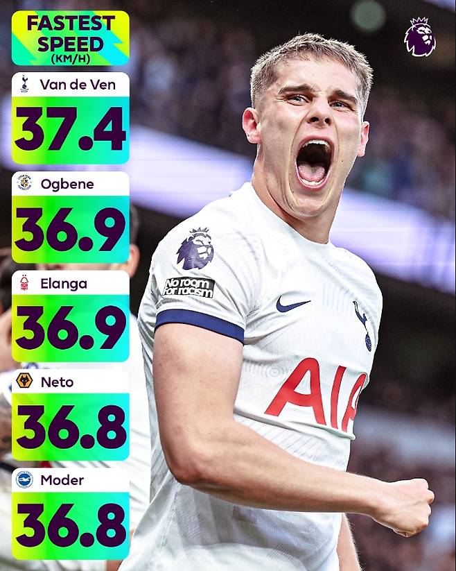 이때 속도 부분에서 토트넘 신입생 미키 판더펜이 1위에 올라 이번 시즌 가장 스피드가 빨랐던 선수인 것으로 밝혀져 눈길을 끌었다.