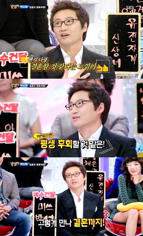 박신양은 후배의 초대로 부산에 갔다가 한 호텔 헬스장에서 지금의 아내 백혜진 씨를 처음 만났다.