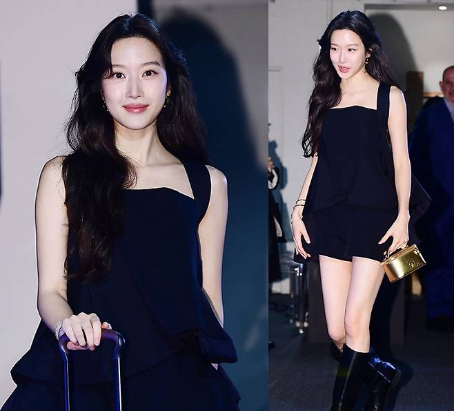 문가영은 독특한 실루엣의 블랙 미니 원피스에 롱부츠를 매치해 시크한 무드를 완성했습니다.