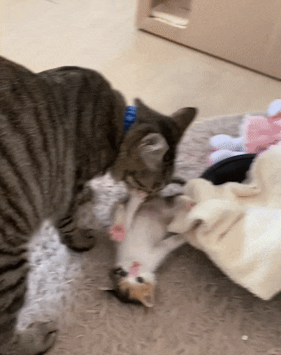 또 아기 고양이가 자라서 놀이를 시작하면 놀이 상대가 되어주고 어딘가 불편해 칭얼거리며 떼를 쓰면 스트레스를 해소해 줍니다. 고양이 사회의 중요한 규칙도 가르쳐줍니다.