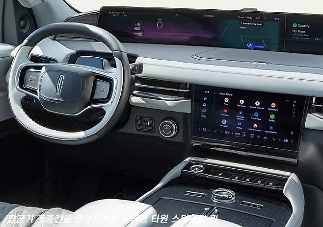 게다가 스티어링 휠이 완전한 원형이 아닌 타원, 혹은 둥근 사각형에 가까운 형태로 디자인 돼 있는 것이 눈에 들어옵니다. 여기에 스포크도 양쪽으로 두 개로 만들어서 어딘가 항공기 조종간 같은 인상도 줍니다.