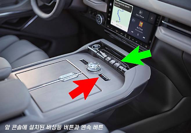 게다가 비상등 스위치는 눈에 잘 띄는 위치와 형태, 색상 등으로 디자인 돼 있어야 하는데요, 내비게이터의 비상등 스위치는 콘솔의 다이얼 노브의 오른쪽에, 즉 운전자로부터 좀 더 먼 오른쪽에, 사진의 빨간색 화살표의 위치에 그것도 다른 버튼들과 ‘아주아주 조화롭게’ 배치돼 있어서 눈에 거의 띄지 않는 무난한 디자인입니다.
