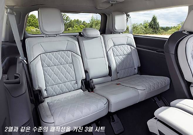 실내에서는 수평 기조의 인스트루먼트 패널과 가로로 긴 디스플레이 패널이 공간을 넓어 보이게 합니다. 과거의 미국 대형 SUV들을 보면 인스트루먼트 패널을 수직 기조로 만들어서 마치 성벽을 쌓은 것처럼 실내가 폐쇄적 인상이었지만, 최근에는 디지털 디스플레이의 적용으로 거의 모든 유형의 차량의 인스트루먼트 패널이 개방적인 수평 형태로 바뀌고 있습니다.