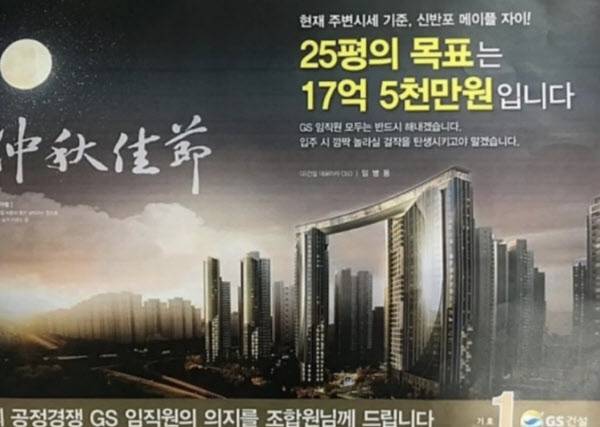 당시 GS건설은 홍보물에서 재건축 후 단지명을 ‘메이플자이’로 설정하겠다면서 “25평의 목표는 17억5000만원입니다, 입주시 깜짝 놀랄 걸작을 탄생시키고야 말겠습니다”라고 강조했다. 수주전이 열렸던 2017년 당시 인근 ‘반포자이’ 같은 주택형이 12억~13억원대, ‘신반포자이’가 11억원대에 주로 거래됐던 상황을 고려한 홍보글이다. 신반포4지구가 재건축 후 ‘메이플자이’로 재탄생할 경우 집값이 인근 아파트 시세 대비 수억원 높아질 것이란 뜻으로 이런 문구를 내건 것으로 보인다.