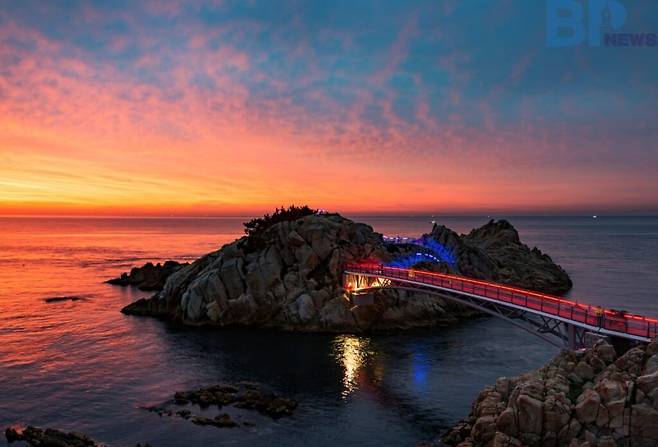 길이가 세 자리 수에 이를 만큼 길게 뻗어 있어 천천히 걸으며 동해의 푸른 결을 오래 바라볼 수 있고, 다리 위에서 바라보는 대왕암 일대의 암석 군락은 마치 한 폭의 풍경화처럼 묵직한 겨울빛을 머금는다.