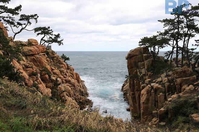송림이 끝나는 순간 시야는 갑자기 확 열리고, 절벽 아래로 푸른 파도가 밀려드는 풍경이 드러난다.