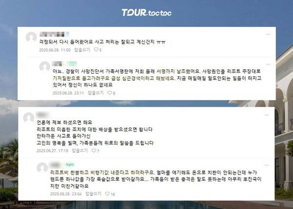 댓글에는 당시 현장을 목격한 다른 한국인 여행객의 증언도 있었습니다. 한 이용자는 "사고 당일 오후 해변에서 구조 장면을 봤고, 당시 구급차는 없었다"며 "인공호흡만 계속하던 모습이 기억에 남는다"고 말했습니다.