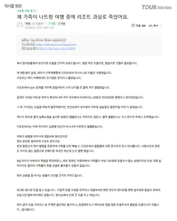 6월 27일 나트랑 여행 커뮤니티에는 "제 가족이 나트랑 여행 중에 리조트 과실로 죽었어요"라는 제목의 글이 게시됐습니다.