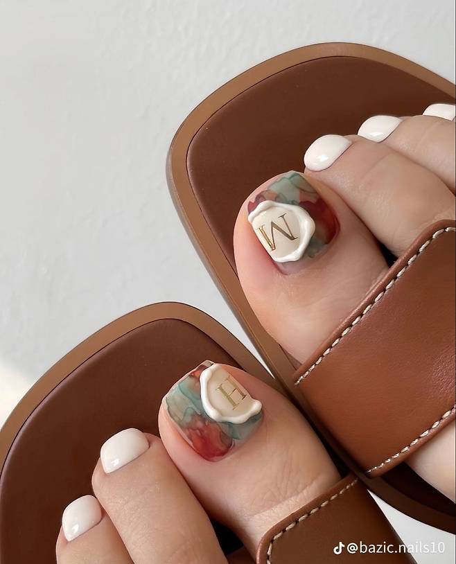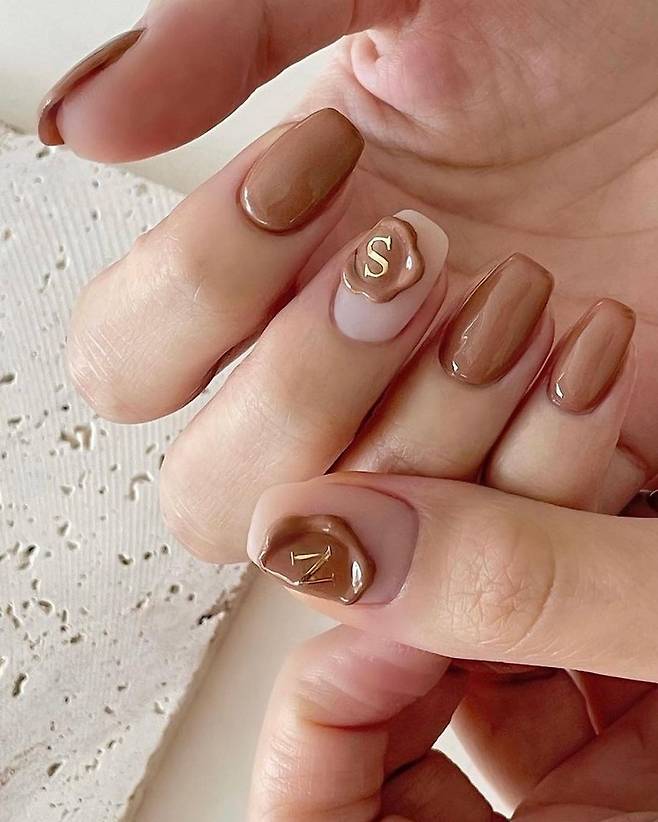 녹아내리는 듯한 질감과 이니셜까지 넣어주면 더 이쁜 네일을 완성해 준답니다