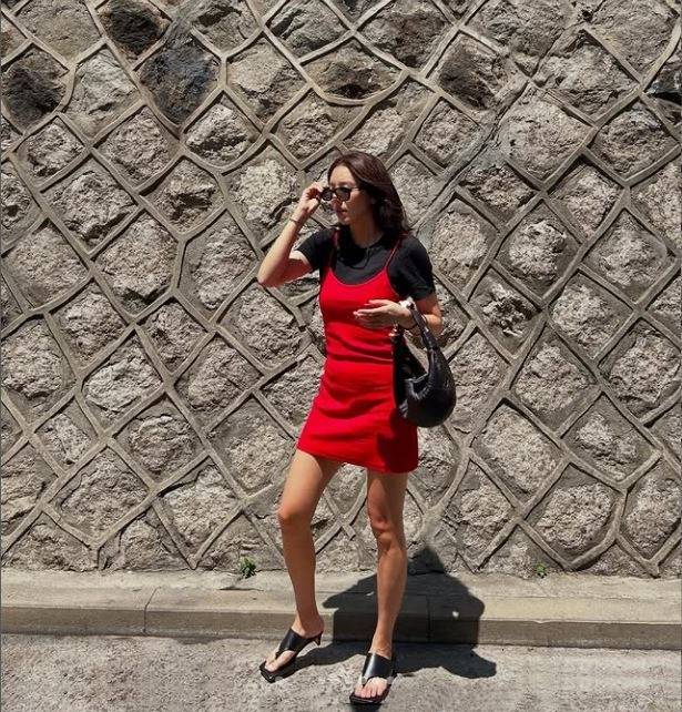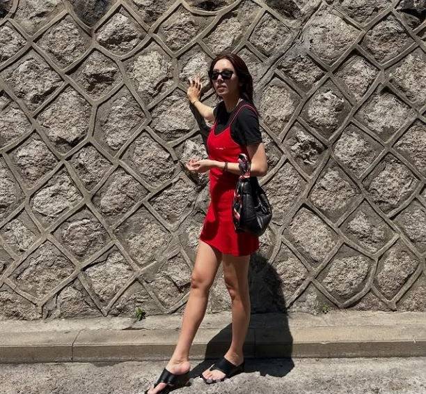 공개된 사진 속 손담비는 블랙 티셔츠와 레드 미니 탱크탑 원피스를 레이어드한 강렬한 생일 파티룩으로 출산 전의 늘씬한 몸매를 과시했다.