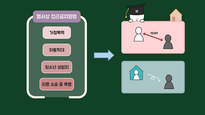 이름은 다양해도 지켜야 할 내용은 비슷한데, 직선거리 100m 이내 접근금지를 포함해 전화, 문자 등 통신수단을 통해 접근하는 것도 제한됩니다.