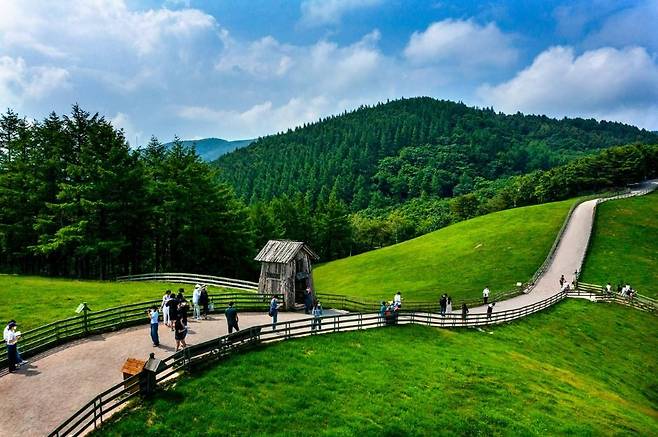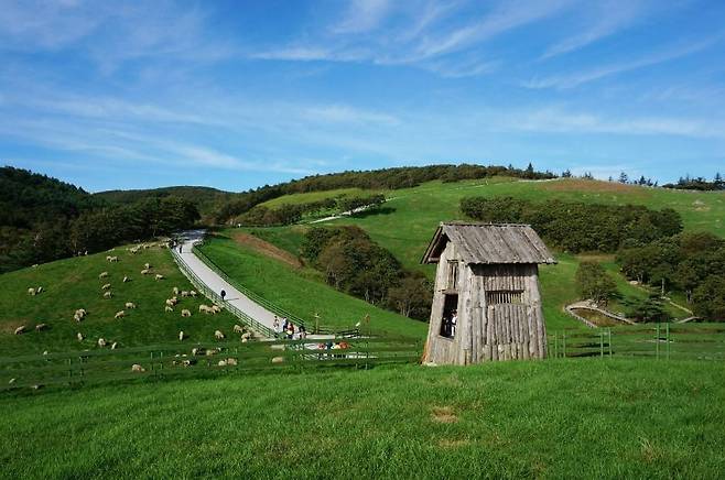 이곳의 가장 큰 즐길 거리는 바로 목장을 한 바퀴 도는 1.2km 산책로예요. 계절마다 색이 바뀌는 고원 풍경을 따라 걷다 보면 초지 위 양떼와 마주칠 수 있고, 길 중간중간 벤치와 포토존(특히 나무 움막 포인트!)도 있어 여유롭게 머무르기 좋아요.