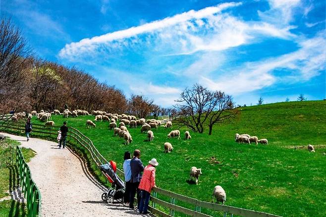 강원도 평창 대관령 고원에 위치한 ‘대관령 양떼목장’은 국내 최초의 양 전문 목장으로, 면양을 방목하는 친환경 목장 문화와 동물복지를 함께 실천하고 있는 곳이에요. 약 20만 5,000㎡ 규모의 너른 초지 위에서 자유롭게 풀을 뜯는 양들의 모습은 도심에서는 느낄 수 없는 고요하고 평화로운 풍경을 선사하죠.