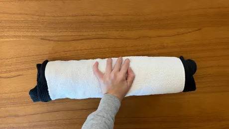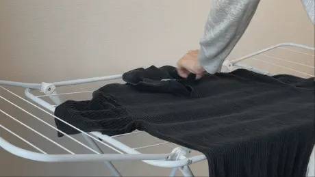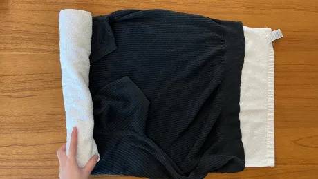 물기를 더 제거하기 위해서는 수건 위에 옷을 펴서 놓고, 둘둘 말아 눌러서 물기를 없앨 수 있습니다.