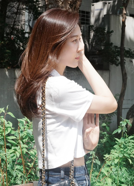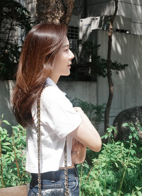 밝은 햇빛 아래에서 촬영된 이 사진 속 김하늘은 화이트 크롭 티셔츠와 중청 데님 팬츠를 매치해 무심한 듯 시원한 여름 패션을 선보였다.