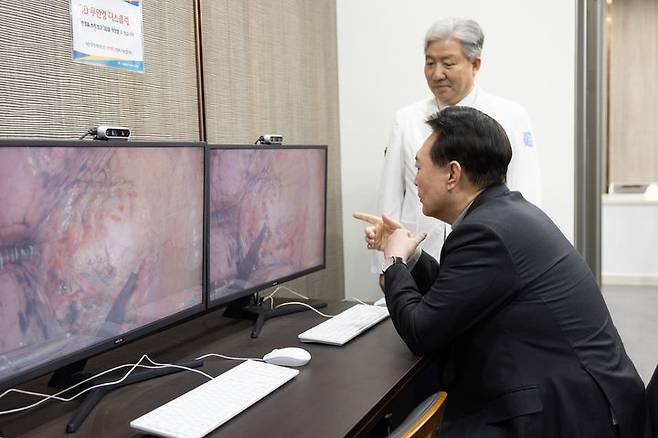 [성남=뉴시스] 윤석열 대통령이 1일 경기 성남 분당서울대학교병원 헬스케어혁신파크에서 생명과 지역을 살리는 의료개혁 주제로 열린 여덟 번째 국민과 함께하는 민생토론회에 앞서 병원 내 임상실습을 위한 스마트 시뮬레이션센터를 방문하고 있다. (사진=대통령실 제공) 2024.02.01. photo1006@newsis.com *재판매 및 DB 금지