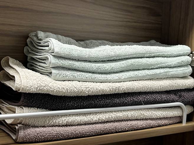 위로 쌓아 올리면 흐트러질 염려도 없고, 수건 여러 장을 쌓을 수 있어 공간도 효율적으로 사용할 수 있습니다.