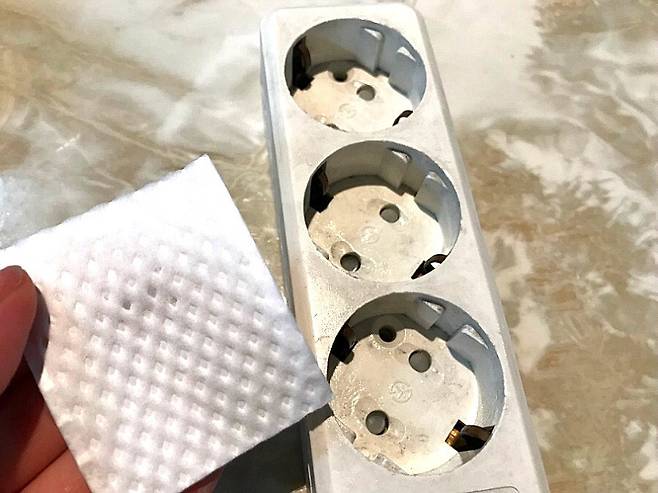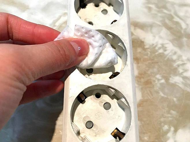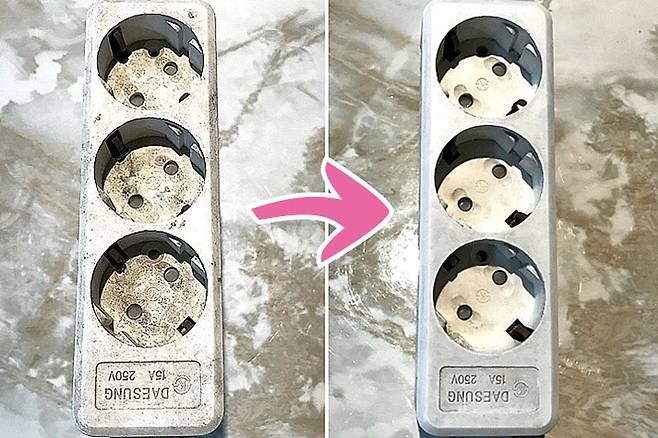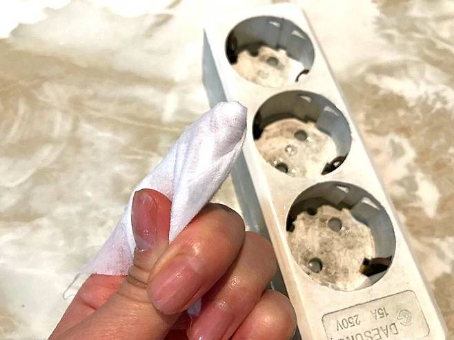 콘센트 안쪽 부분까지 꼼꼼하게 닦아내면 몰라보면 깨끗해진 멀티탭을 발견할 수 있을 거예요.