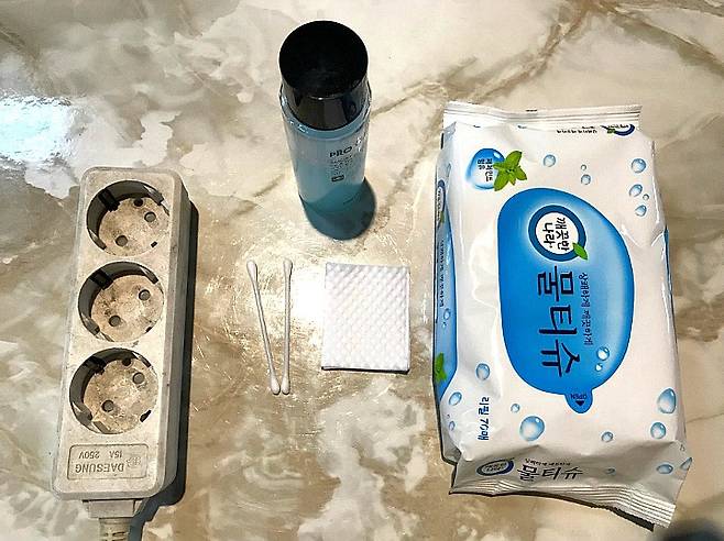 저 더러워진 면봉과 물티슈들이 보이시나요? 3구짜리 멀티탭 청소하는 데 물티슈 2장과 면봉 하나 밖에 들어가지