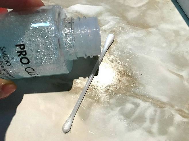 이제 면봉에 메이크업 리무버를 묻혀주세요. 이때 과도하게 많이 묻힌다고 더 깨끗하게 닦이는 건 아니니 적당량만 묻혀주면 돼요.