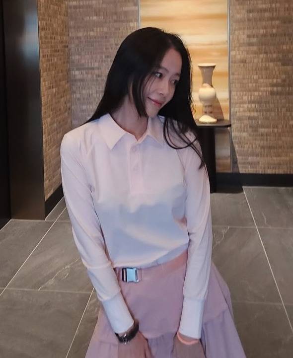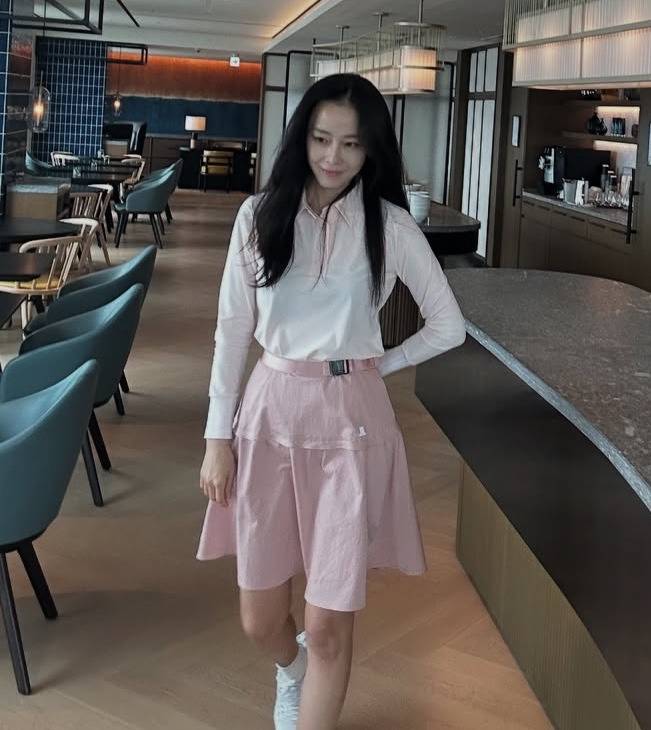 전체적인 컬러 톤을 은은한 핑크 계열로 통일해 통일성과 깔끔한 스타일링을 강조했으며, 화이트 스니커즈를 더해 편안함과 캐주얼함을 동시에 연출했습니다.