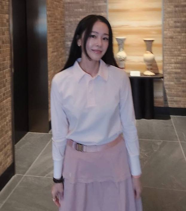 하의는 동일 톤의 플레어스커트를 매치해 여성스러우면서도 활동성을 강조했으며, 허리 벨트 디테일로 포인트를 주어 실루엣을 안정감 있게 잡아주었습니다.