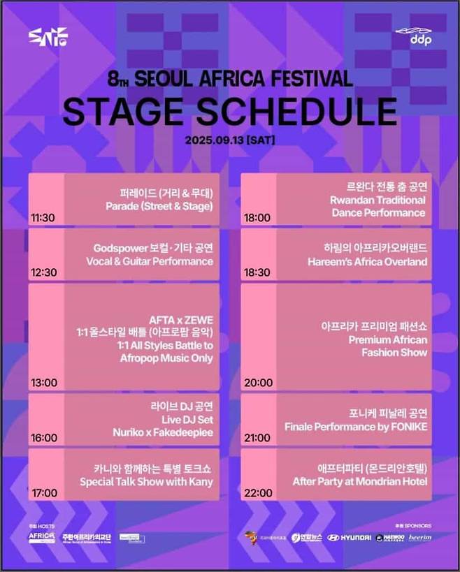 공식 무대에서는 나이지리아 출신 보컬리스트 갓스파워(Godspower), 한국 내 르완다 커뮤니티 공연단 ‘이토레로 우무쵸’, 가수 하림이 이끄는 프로젝트 밴드 ‘아프리카 오버랜드’의 공연이 연이어 펼쳐진다. 이들의 무대는 아프리카 음악의 다양성과 역동성을 서울 시민들에게 생생히 전달할 것으로 보인다.