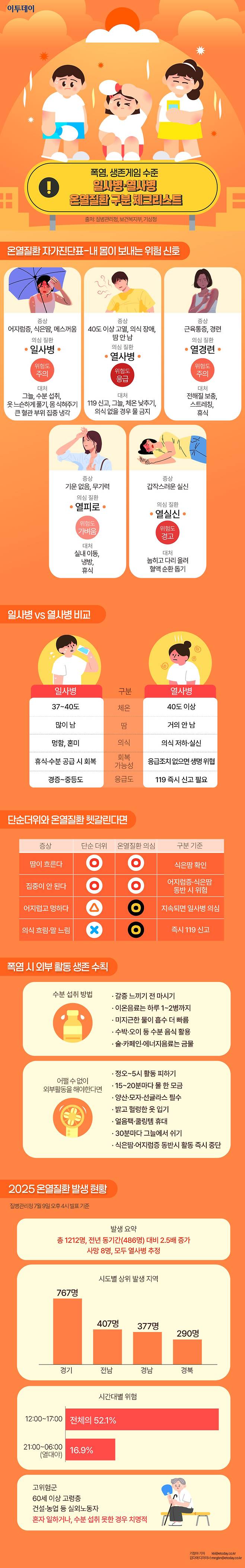 식은땀·어지럼증 등 초기 증상부터 응급대처법, 생존수칙까지…일사병과 열사병의 구분법을 그래픽으로 정리했습니다.