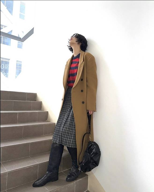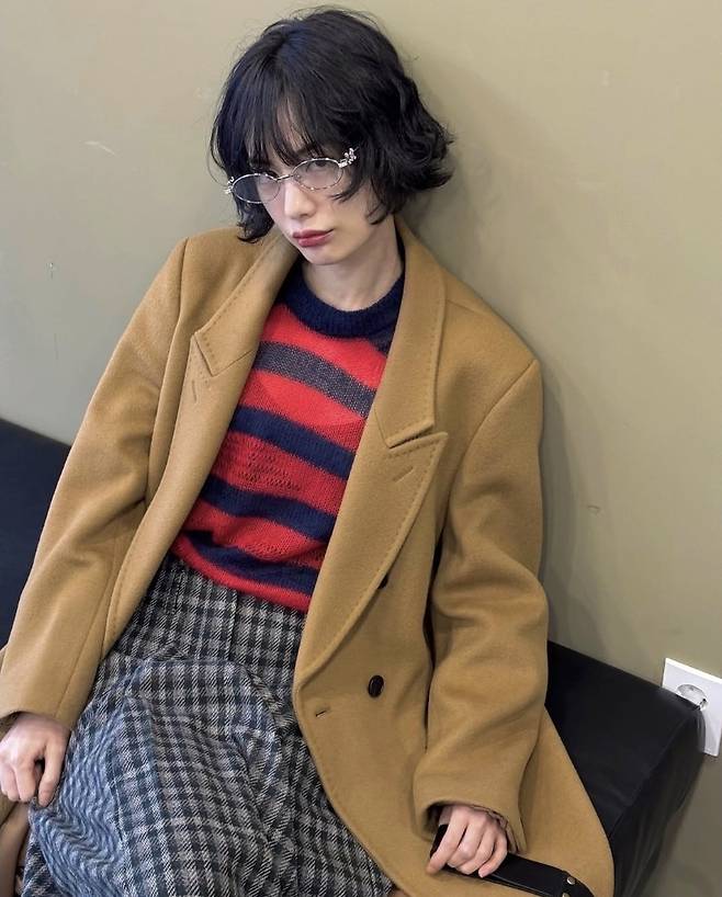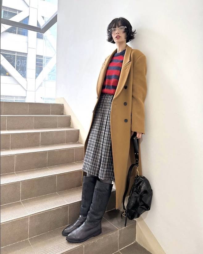 여기에 체크 패턴의 롱스커트를 매치해 고급스러운 레트로 스타일을 강조했으며, 카멜 컬러의 롱코트를 더해 세련된 계절감을 담아냈습니다.