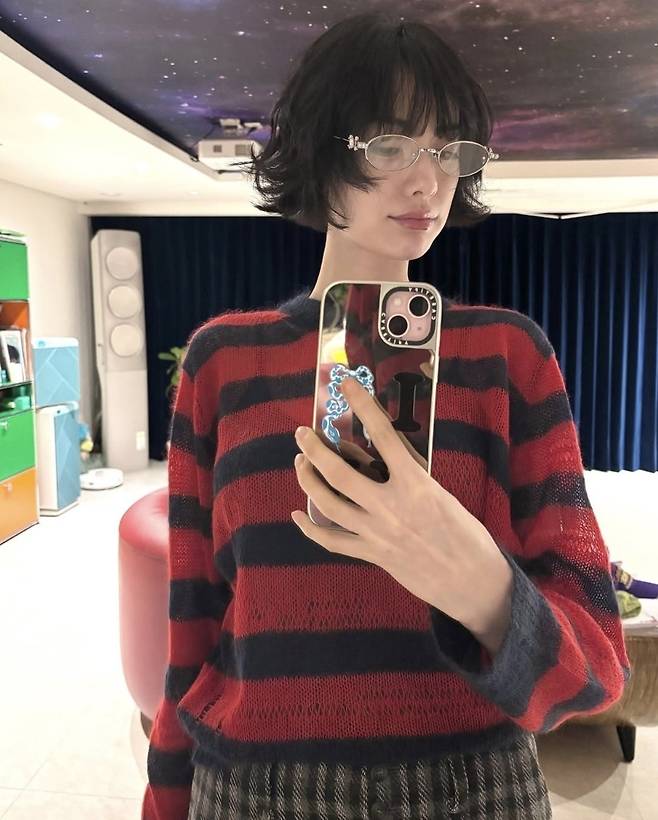나나는 강렬한 레드와 네이비 스트라이프 패턴의 시스루 니트를 선택해 클래식하면서도 트렌디한 무드를 연출했습니다.