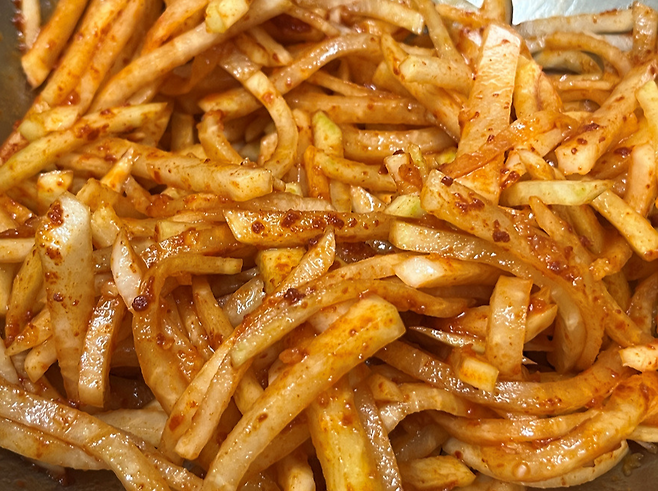 이제 절인 무에 준비한 양념을 넣고 고루 버무려줍니다. 이때 힘주어 세게 비비지 말고, 손끝으로 살살 뒤집듯이 버무려야 무가 부서지지 않고 아삭한 식감이 유지됩니다. 마지막으로 쪽파나 대파, 통깨를 살짝 넣어 마무리해 주세요.