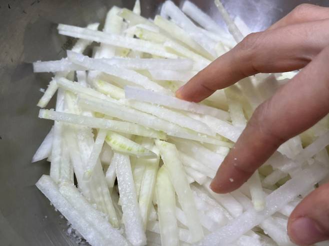 여기서 끝이 아닙니다. 소금만 넣어 절이는 게 아니라 "설탕" 반 스푼도 반드시 같이 넣으세요. 설탕이 들어가야 무의 수분이 고르게 빠지고, 단맛이 배어들어 아삭한 식감과 감칠맛이 살아납니다. 또한 단맛으로 짠맛의 자극을 부드럽게 잡아주는 역할을 합니다.