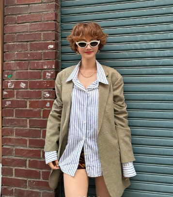 겉에는 베이지 색의 박시한 자켓을 착용해 성숙미를 자아냅니다.