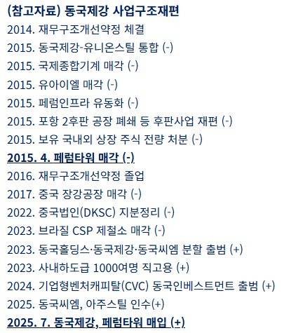 다만 동국제강그룹은 2010년대 중반부터 지속된 업황 침체에 따른 실적 악화로 신용등급 조정을 겪으며 2015년 4월에는 페럼타워를 매각하기에 이른다. 이후 회사는 불확실성을 줄이고 핵심 역량을 강화하며 철근·형강·컬러강판 등 수익성 중심의 철강사업 포트폴리오로 전환했다.