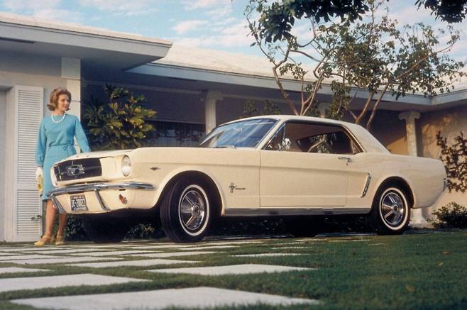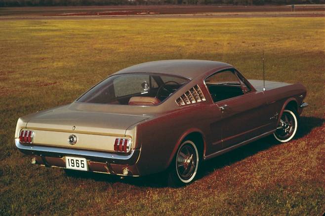 1964년 4월에 데뷔한 1세대 머스탱은 포드의 소형차 팰콘(Falcon)을 바탕으로 만들어졌다. 프로젝트 이름부터 ‘스페셜 팰콘’이었다.물론 팰콘과 머스탱 모두 미국 기준으로는 소형차였지만 실제 덩치는 상당히 컸다. 1964년 4월 데뷔 당시에는 3박스 하드톱 쿠페와 컨버터블 두 가지였지만 1965년형 모델부터 패스트백 모델이 추가되었다. 패스트백은 출시 직후부터 가장 인기 있는 모델이 되었다.