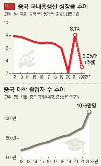 중국 청년층의 자포자기 정서는 최근 중국 경제 상황을 그대로 반영하는 것이다. 중국의 경제성장률은 2012~2015년 7%대, 2016~2018년 6.7~6.9%를 보이다가, 미국과의 무역분쟁이 본격화한 2019년 6.0%로 하락했다. 코로나19가 발생한 2020년에는 2.2%까지 급락했고, 지난해에는 전년도 기저효과로 8.1%로 회복했다가 올해 다시 3%대 성장에 그칠 것으로 예상된다.