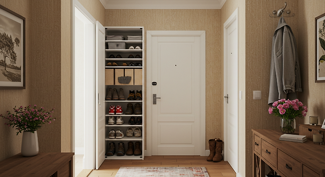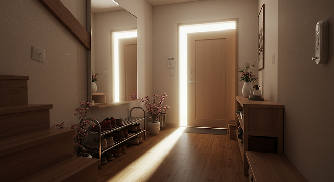 현관은 외부에서 좋은 기운이 들어오는 ‘입구’ 역할을 하는데, 거울이 그 앞에 있으면 들어오려는 기운을 그대로 밀어내는 구조가 됩니다.