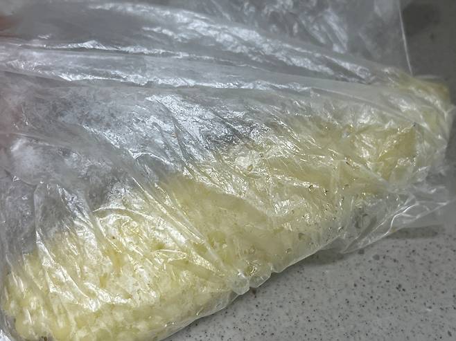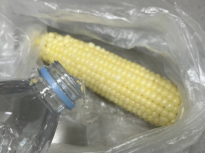 전자레인지를 활용해도 촉촉한 옥수수를 데울 수 있습니다. 해동은 동일하게 1~2시간 미리 꺼내서 해두세요. 옥수수는 비닐에 넣고 물을 살짝 넣어 줍니다.