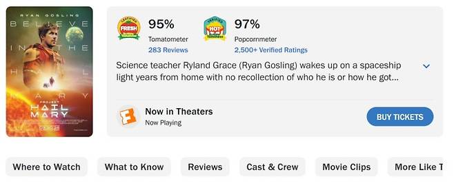 라이언 고슬링 주연 프로젝트 헤일메리 개봉 후 평가 우수..이동진 평론가 평점은?