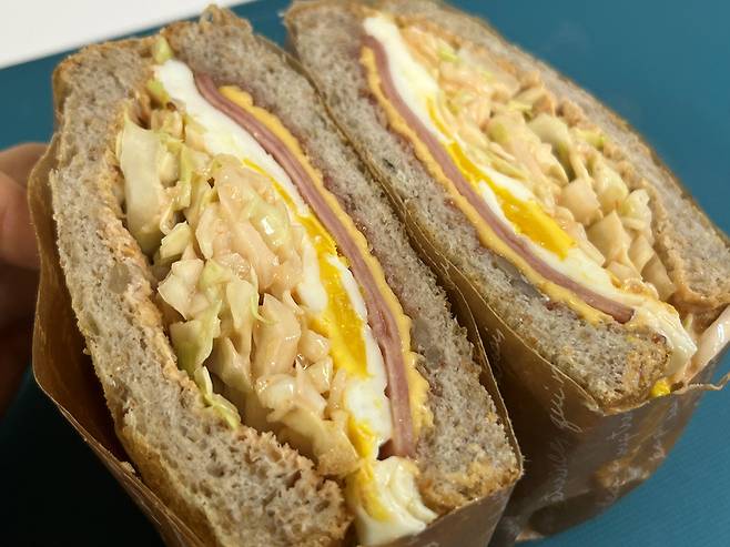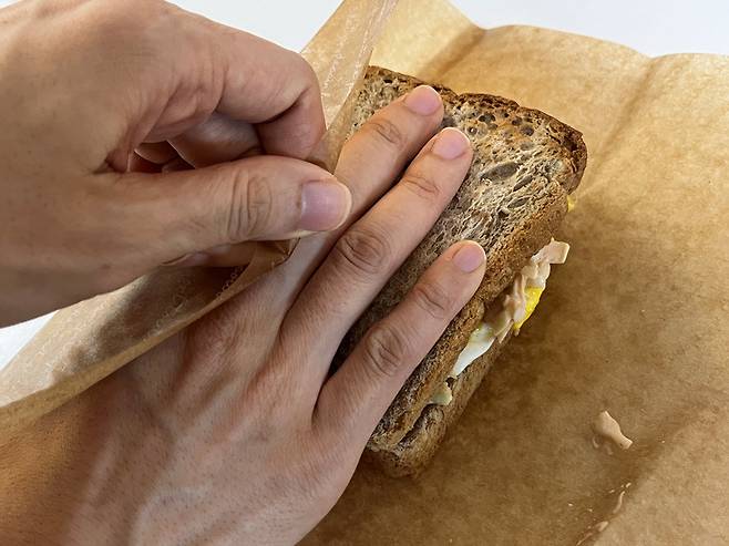 아랫면의 유산지는 반듯하게 접은 뒤 테이프로 고정해 주세요. 종이 자체가 두껍고 질겨서 흐트러지기 쉬운 샌드위치를 단단하게 잡아주는 데 딱 좋습니다.
