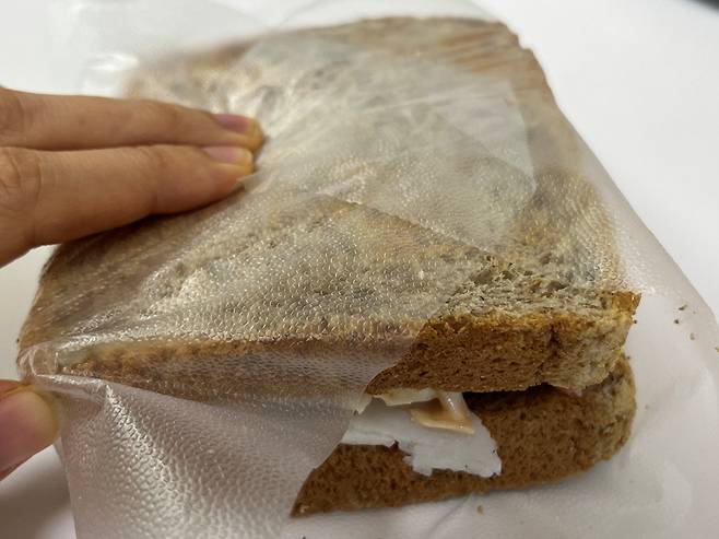 샌드위치를 쌀 때는 최대한 랩을 쫙 당겨서 팽팽하게 싸주는 것이 좋습니다. 그래야 재료가 나오거나 흐트러지지 않아요.